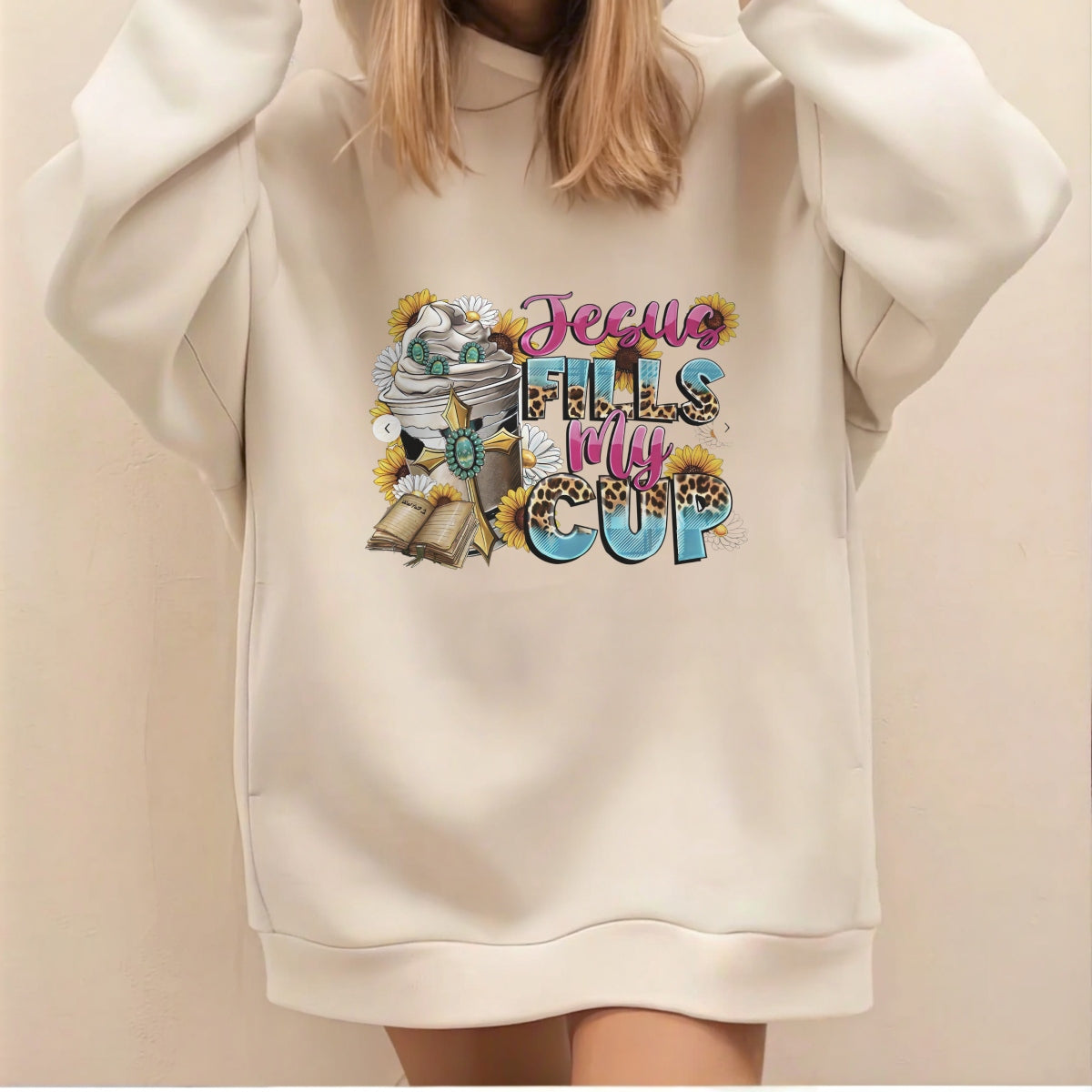 DTF Heat Transfer Iron On Sticker , Floral Bible Cross with "Jesus FILLS My CUP" Verse , Christian Faith Decor Sticker for Clothing, Tote Bags