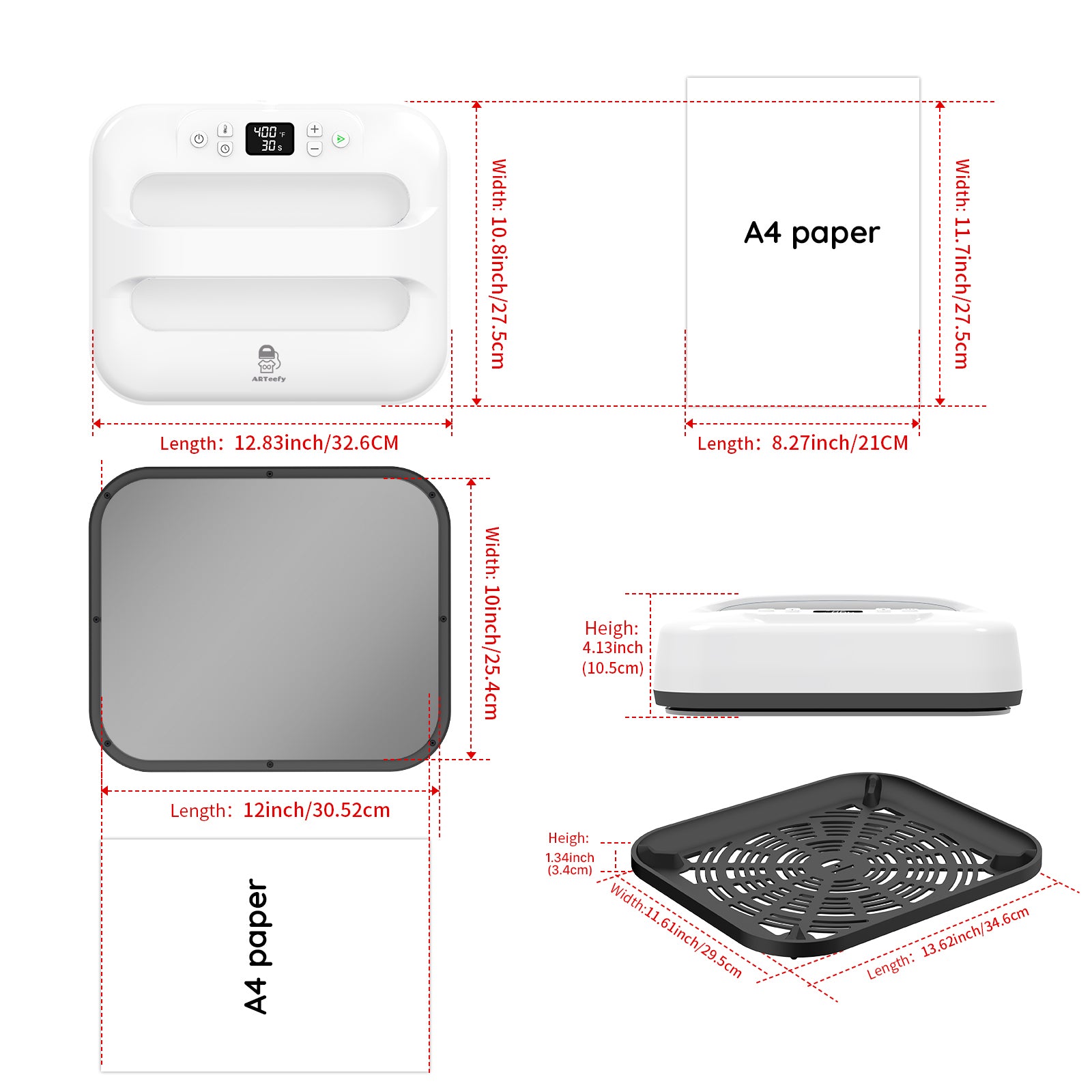 12'' X 10'' HEATING PLATE: Easy press 12 inches x 10 inches size (30 .52centimeters x 25.4 centimeters) ideal for larger T-shirts, jackets, sweatshirts, polo shirts, banners, blankets, canvas bags, and more large projects. The lightweight of only 8.6 lbs is perfect for a variety of non-commercial heating transfer work.