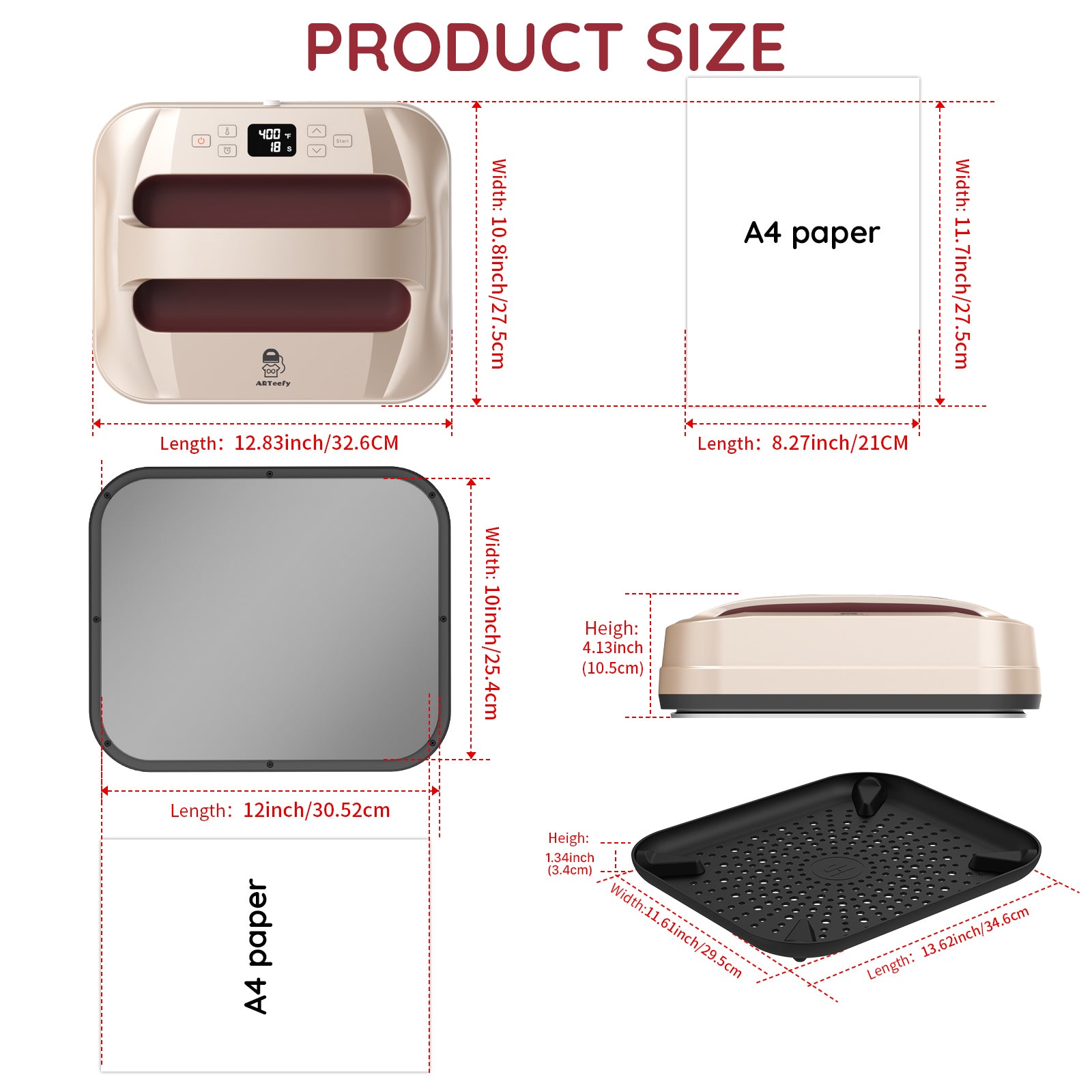 12'' X 10'' HEATING PLATE: Easy press 12 inches x 10 inches size (30 .52centimeters x 25.4 centimeters) ideal for larger T-shirts, jackets, sweatshirts, polo shirts, banners, blankets, canvas bags, and more large projects. The lightweight of only 8.6 lbs is perfect for a variety of non-commercial heating transfer work.