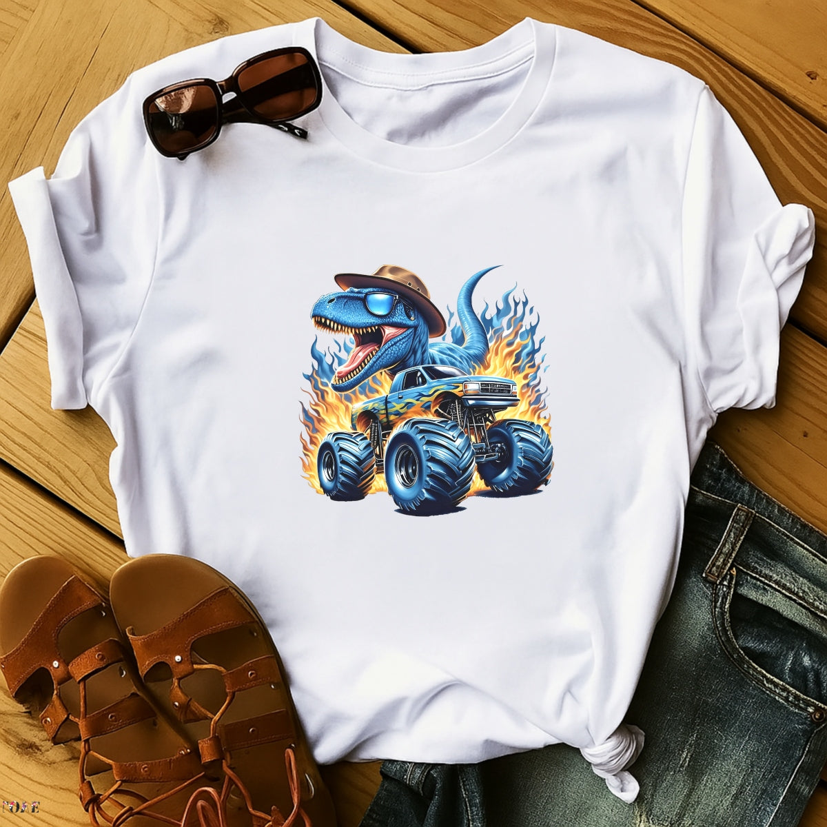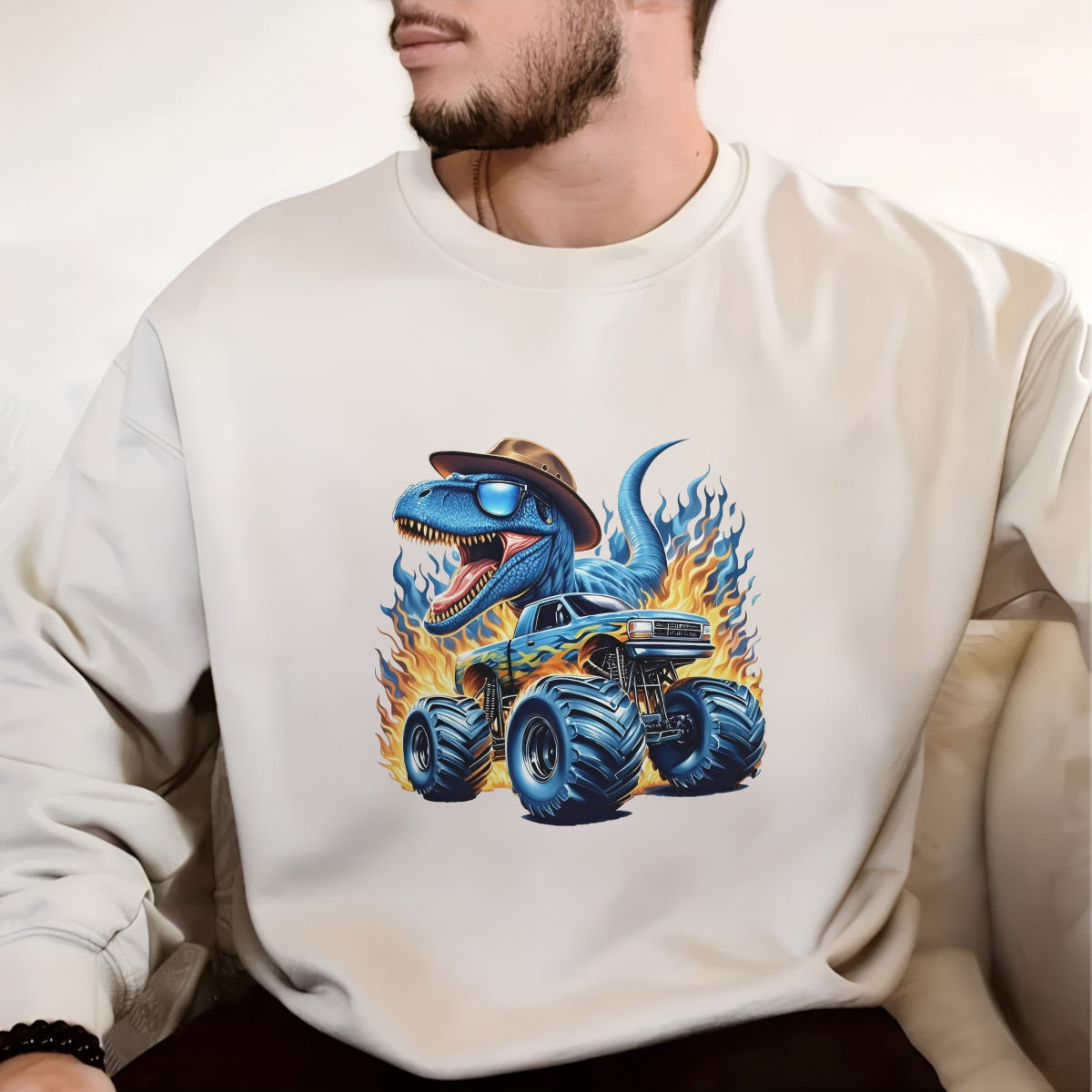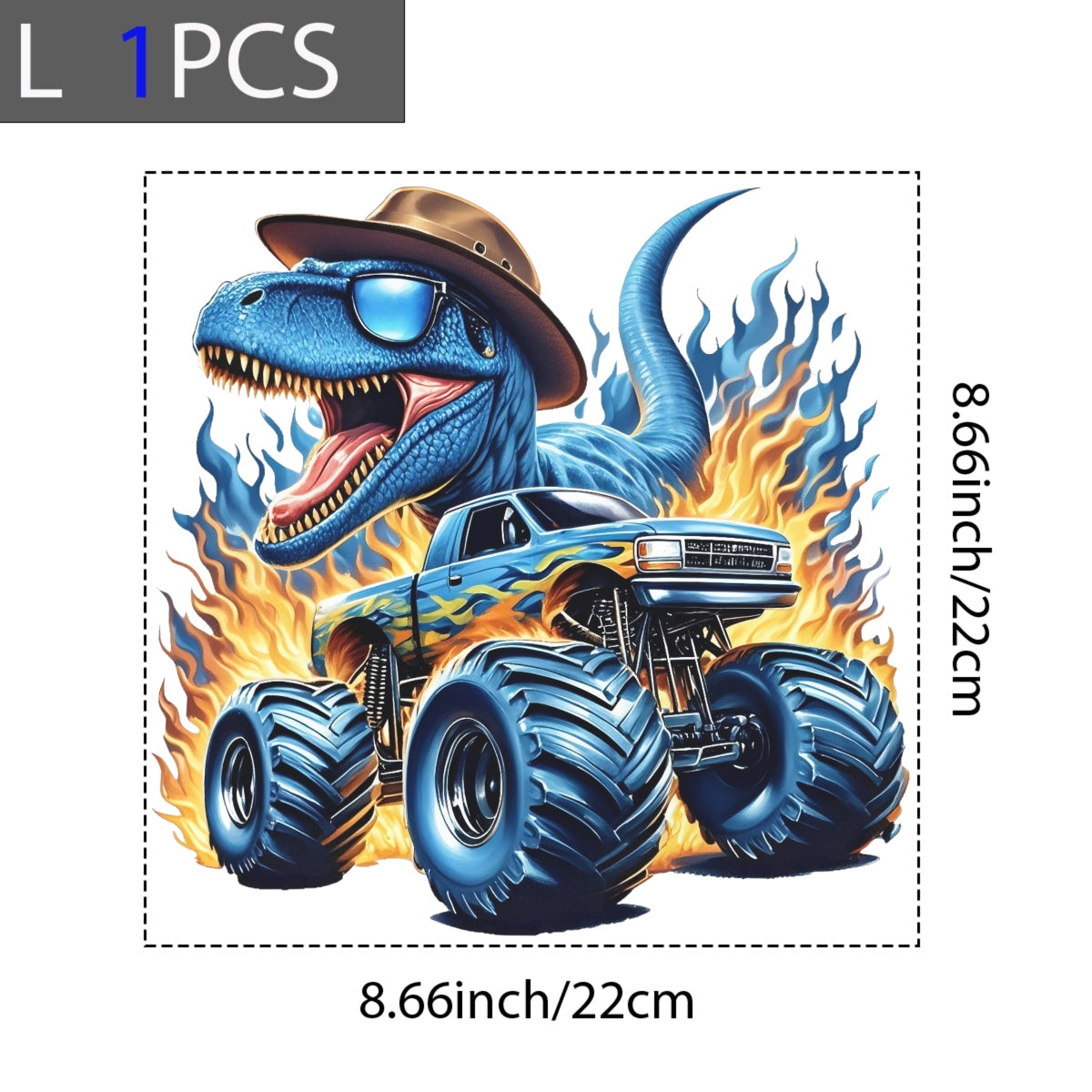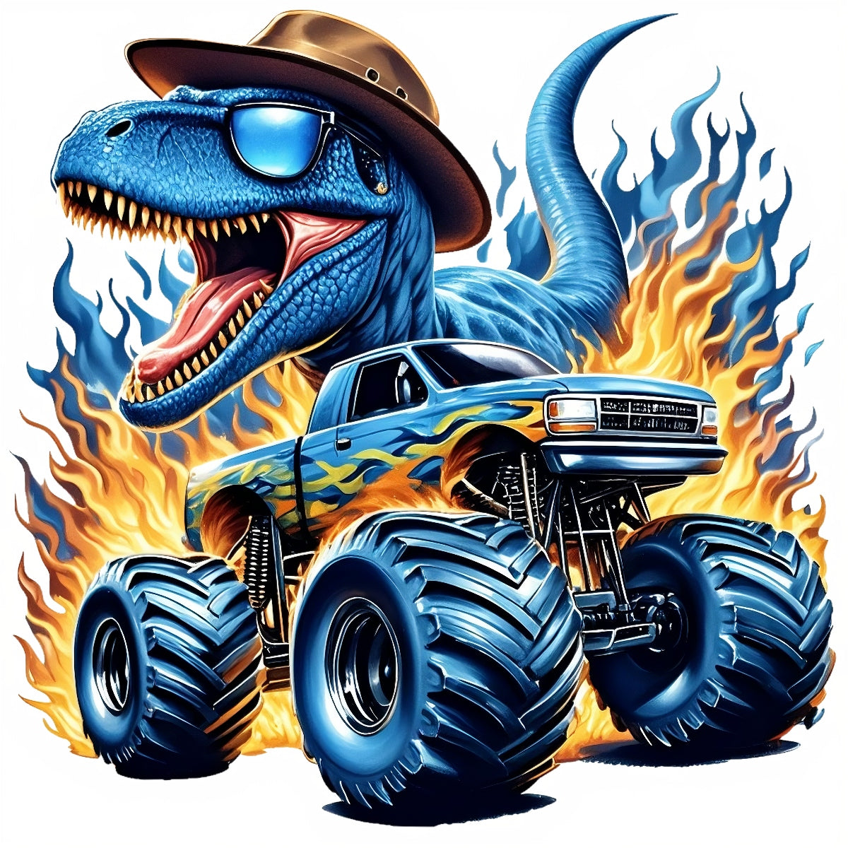 Blue Dinosaur Monster Truck DTF Iron-On Sticker , 'Roaring Flames Adventure' Design,Automotive Decal for T-Shirts, Hoodies