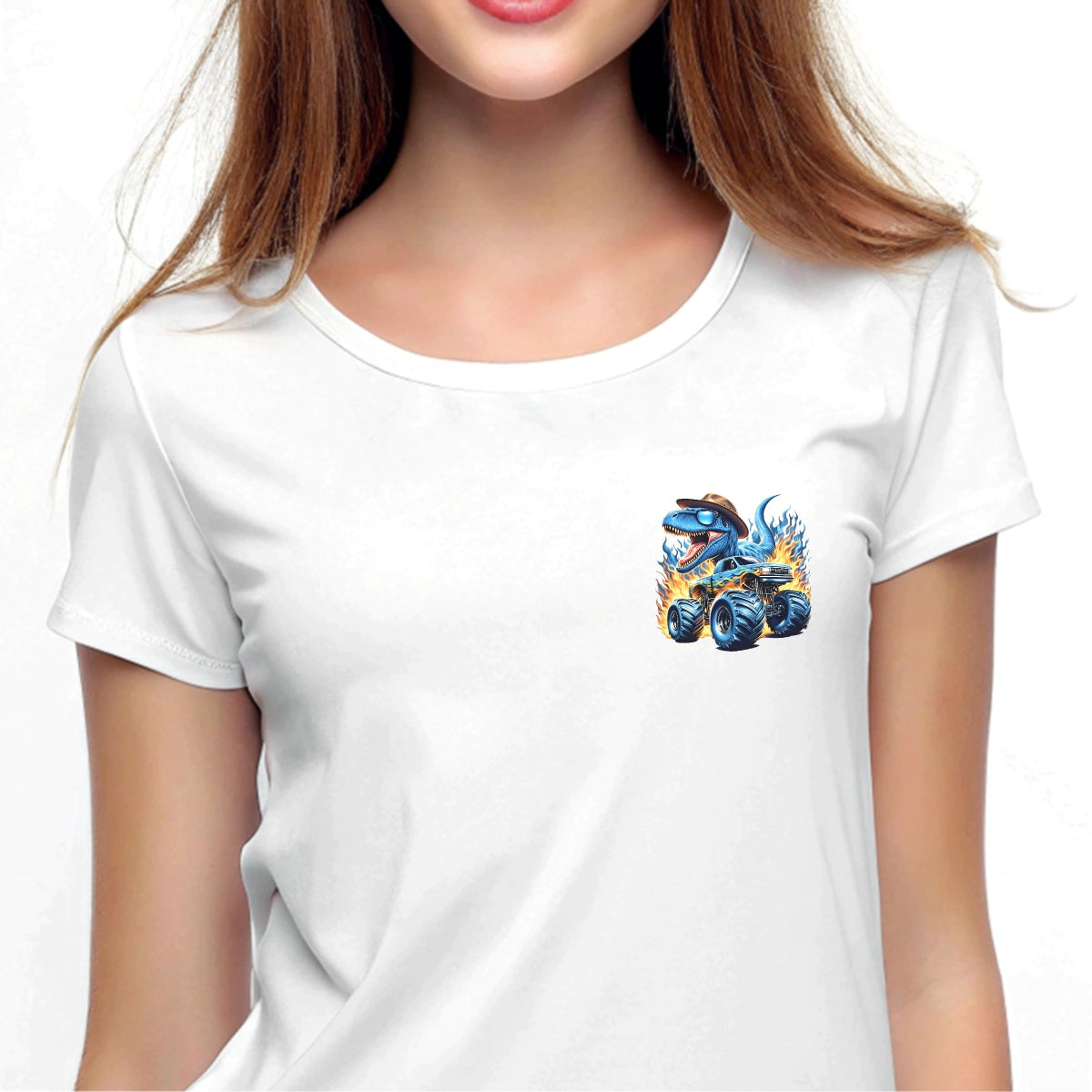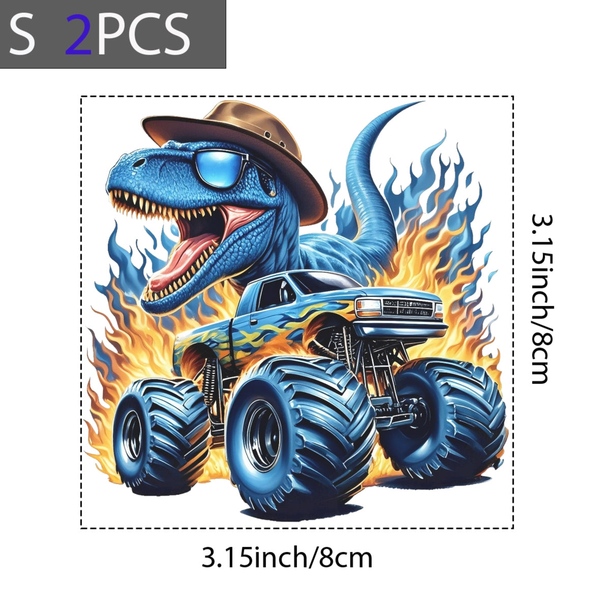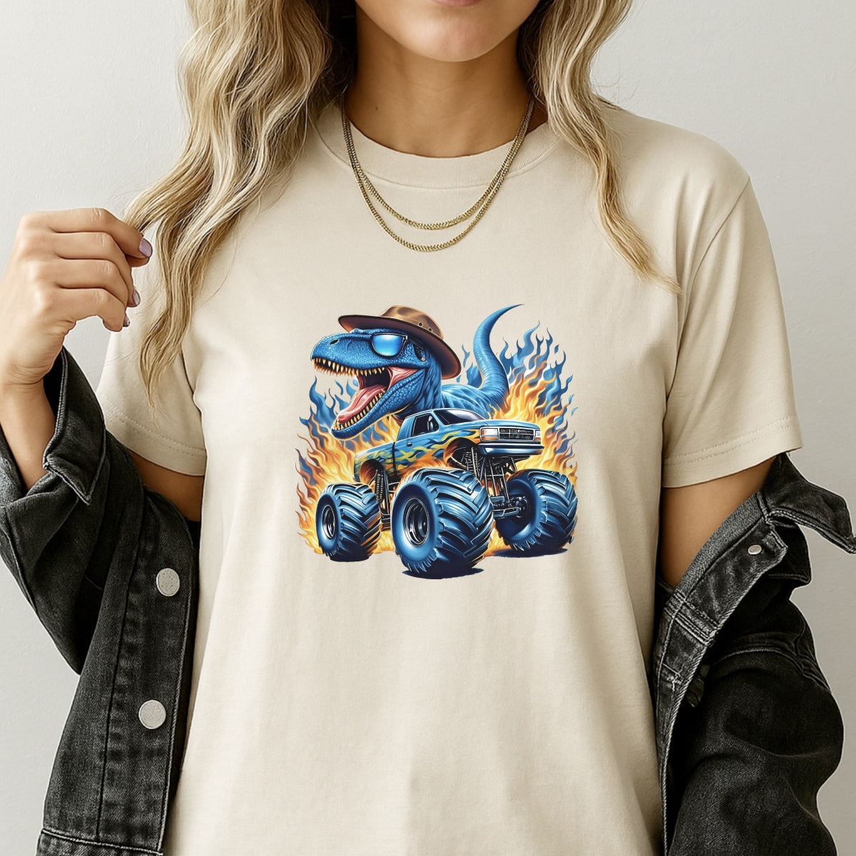 Blue Dinosaur Monster Truck DTF Iron-On Sticker , 'Roaring Flames Adventure' Design,Automotive Decal for T-Shirts, Hoodies