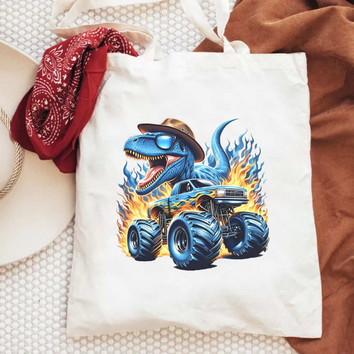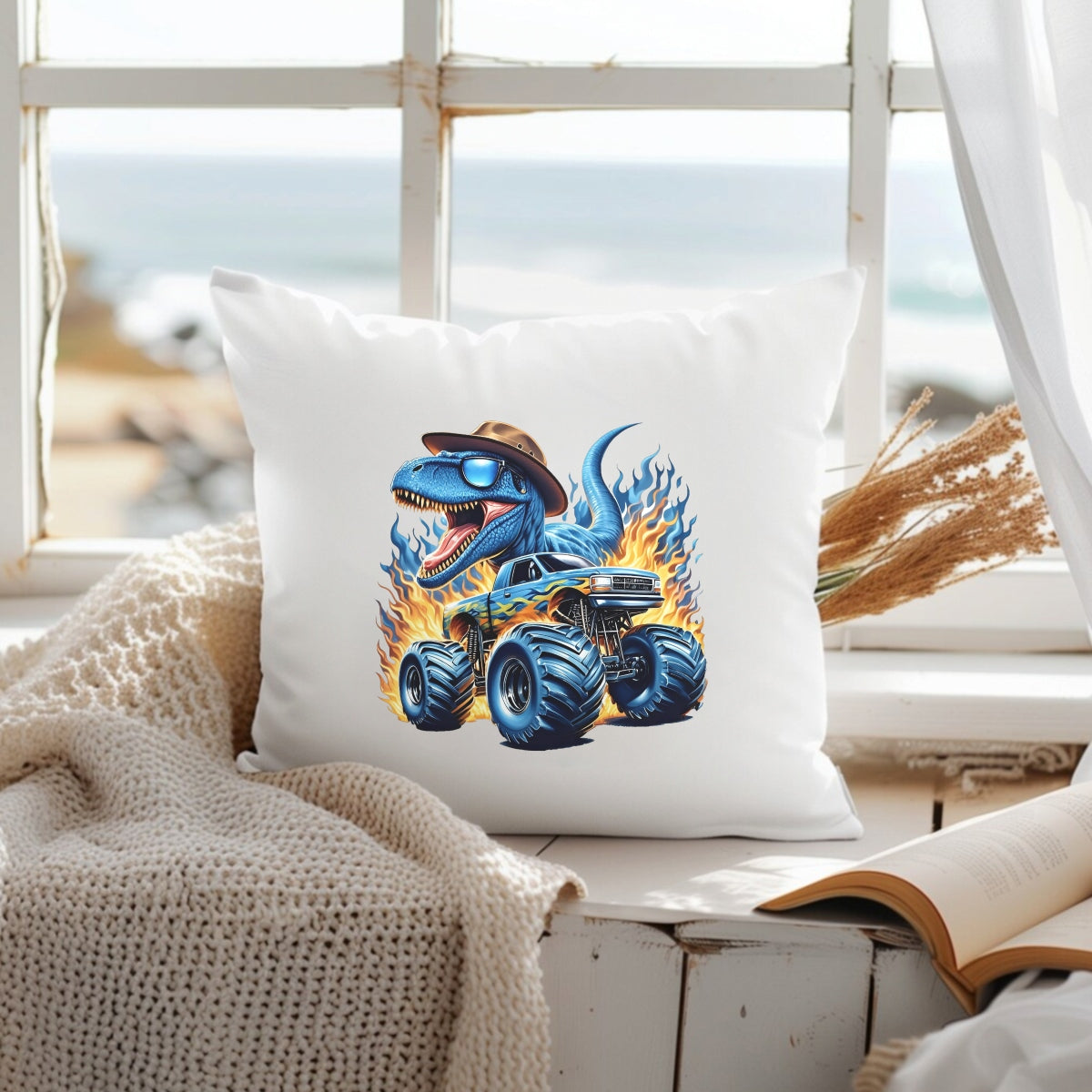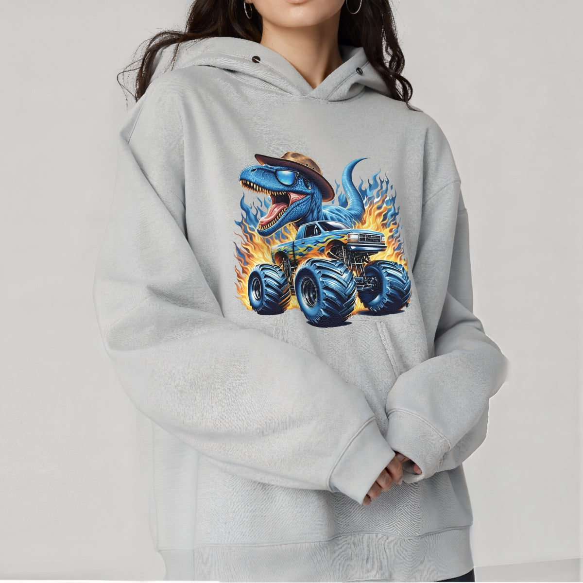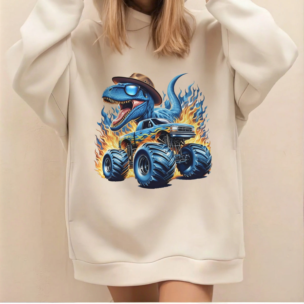 Blue Dinosaur Monster Truck DTF Iron-On Sticker , 'Roaring Flames Adventure' Design,Automotive Decal for T-Shirts, Hoodies