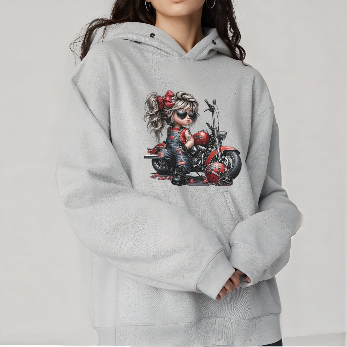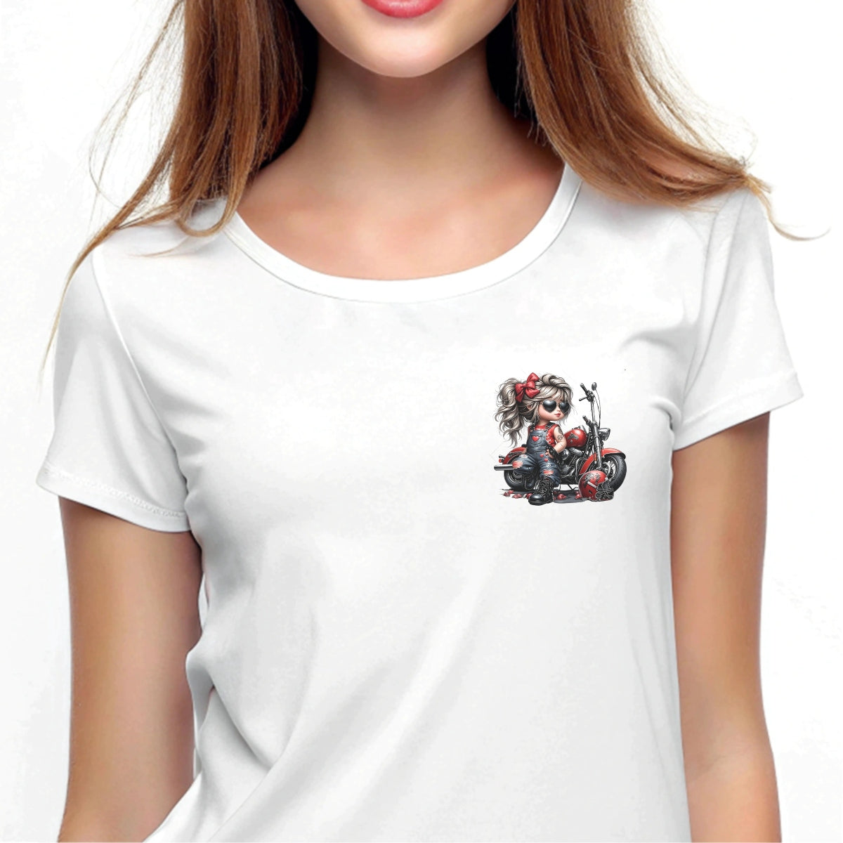 DTF Heat Transfer Iron On Sticker, Cool Biker Style Little Biker with Heart Sunglasses and Red Denim Overalls, Decal for Clothing, Tote Bags