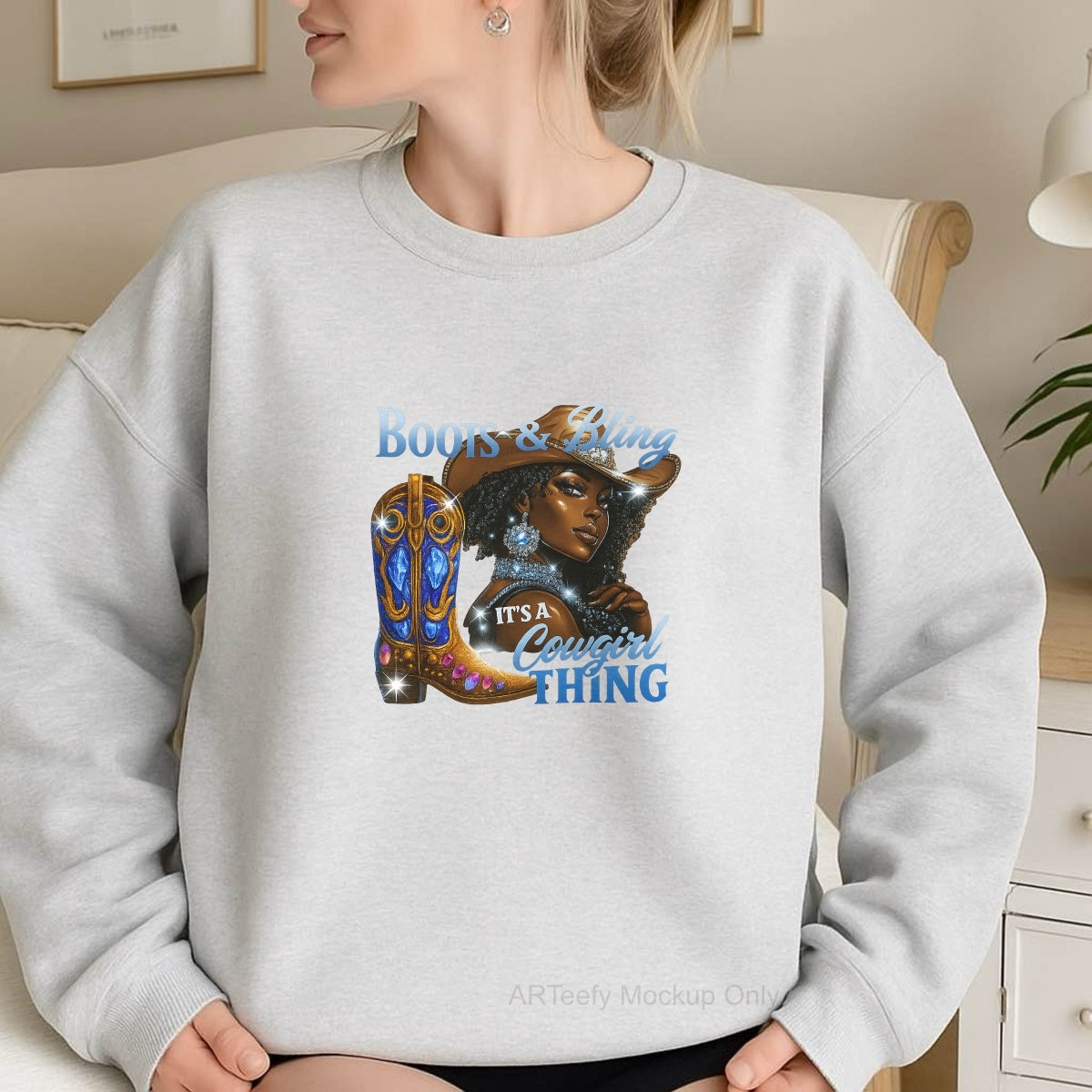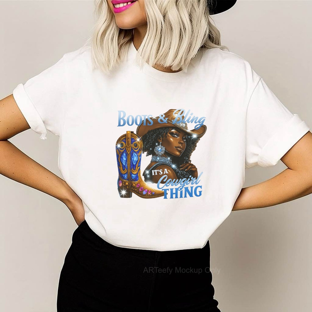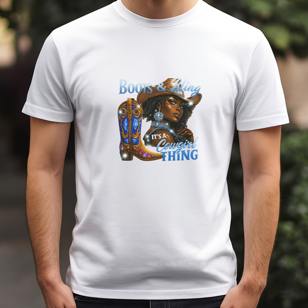 DTF Heat Transfer Iron On Sticker, Glitzy Cowgirl & Boots Graphic, For Western Style Apparel And Rodeo Decor