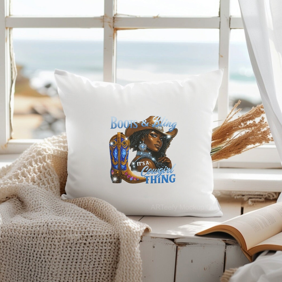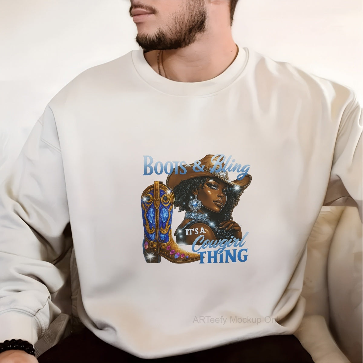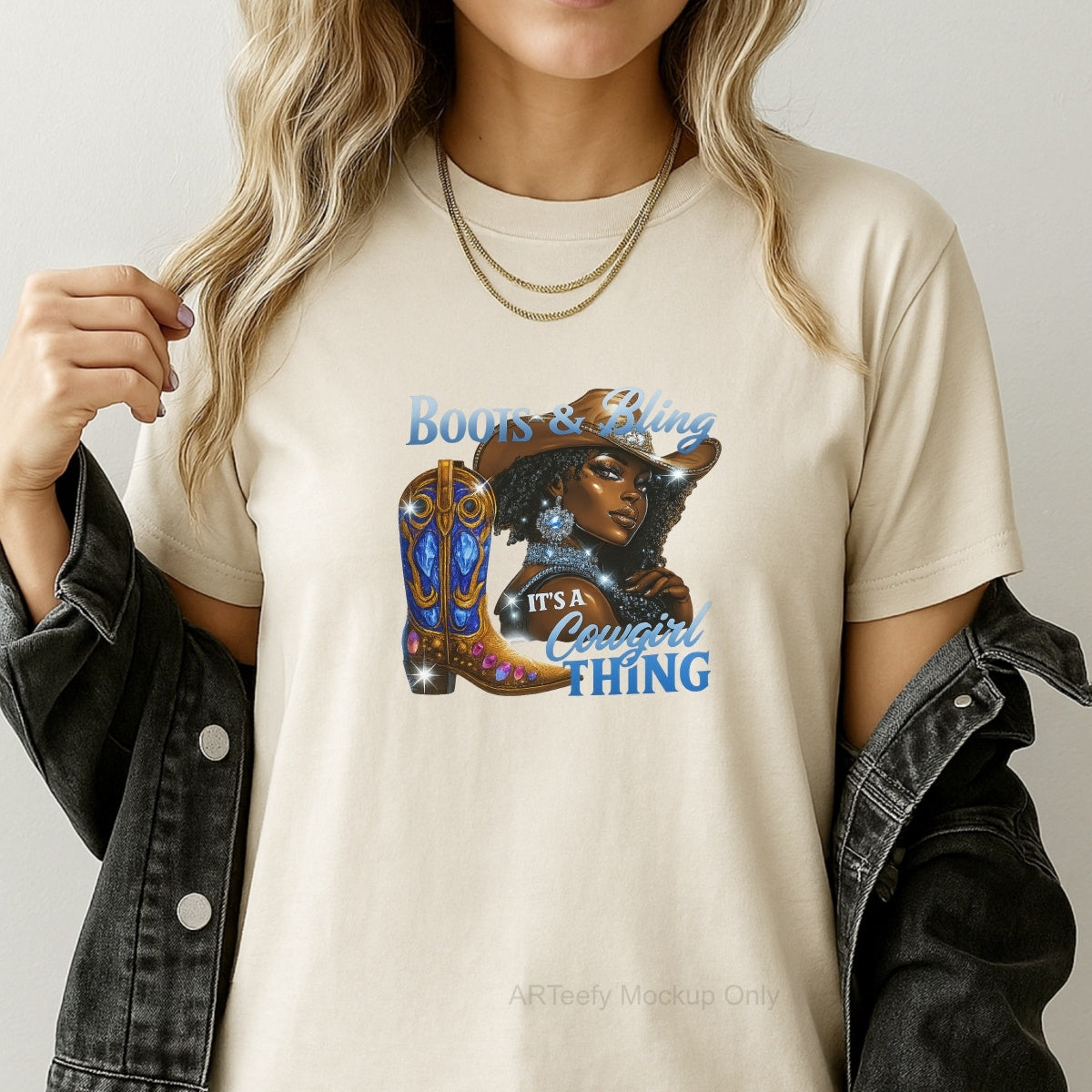 DTF Heat Transfer Iron On Sticker, Glitzy Cowgirl & Boots Graphic, For Western Style Apparel And Rodeo Decor