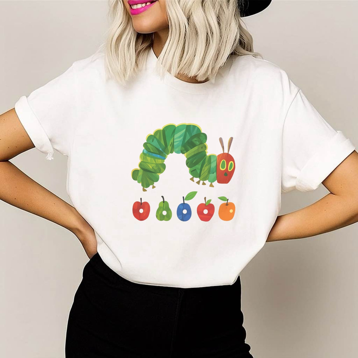 DTF Heat Transfer Iron On Sticker, Iconic Hungry Caterpillar & Fruit Graphic, for Retro Storybook Fashion & Literary Gifts