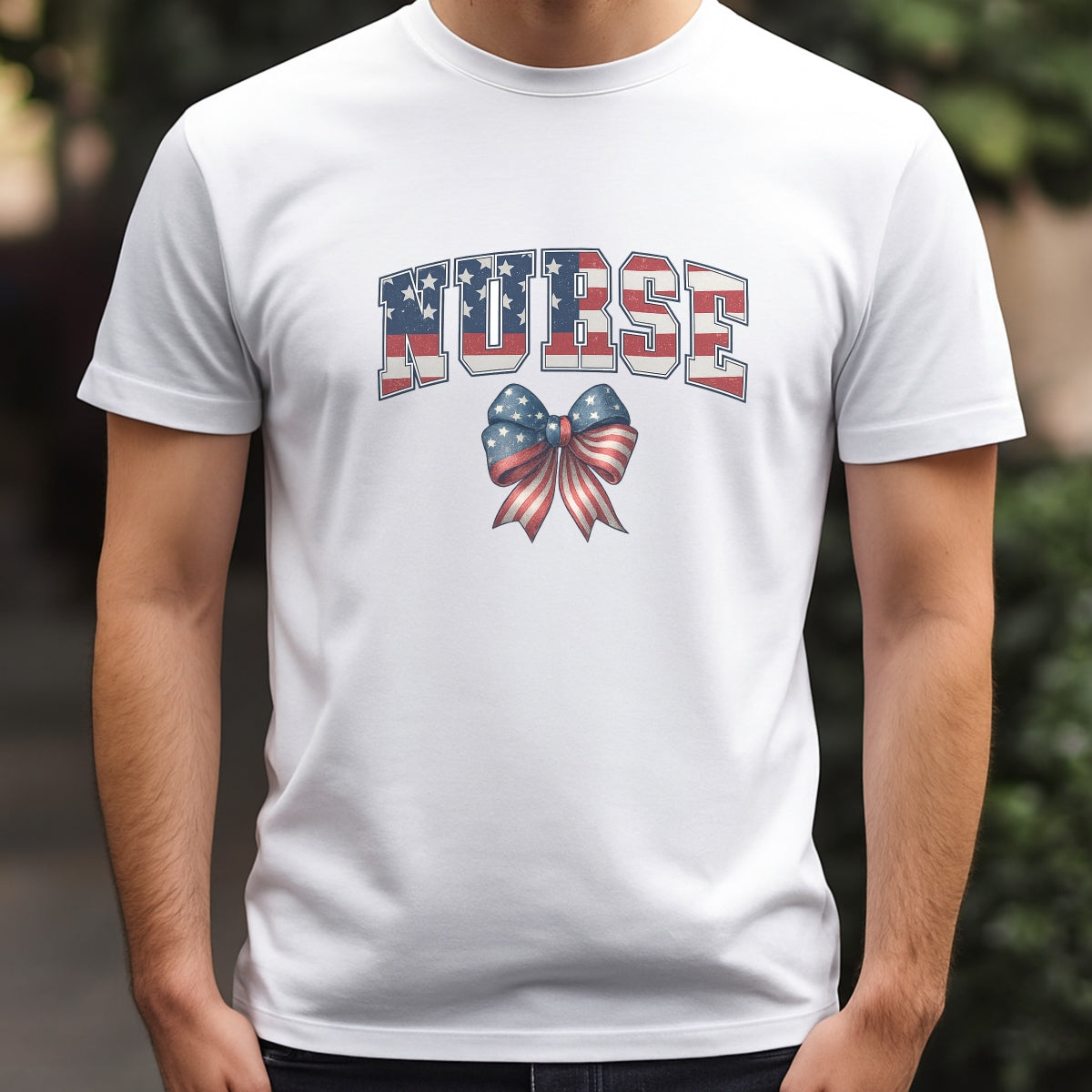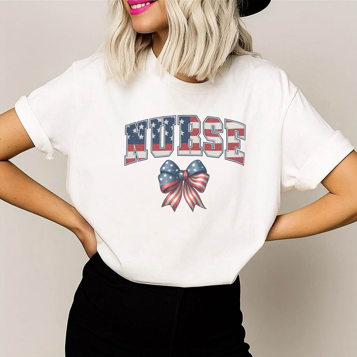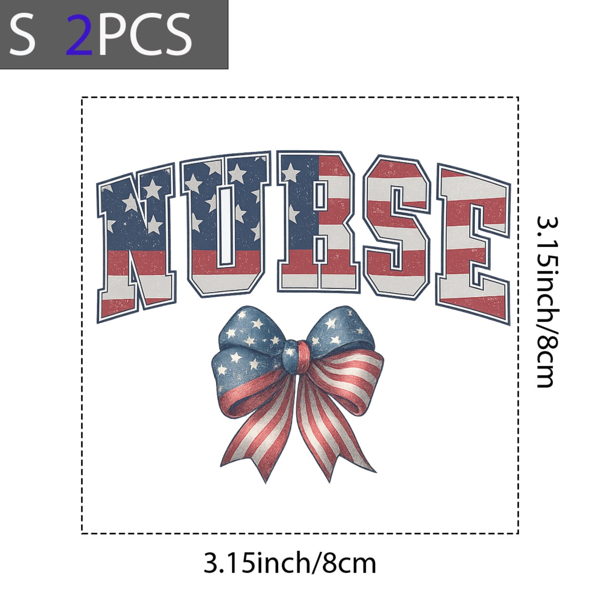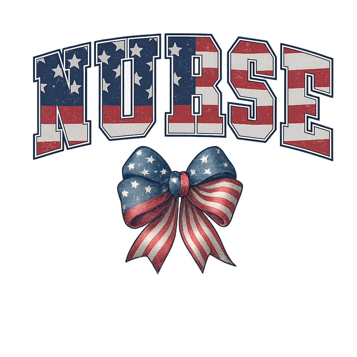 DTF Heat Transfer Iron On Sticker, Patriotic Nurse American Flag Bow Design, for Nurse Apparel and Patriotic Medical Merch