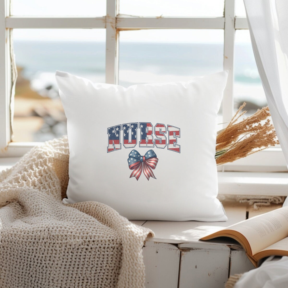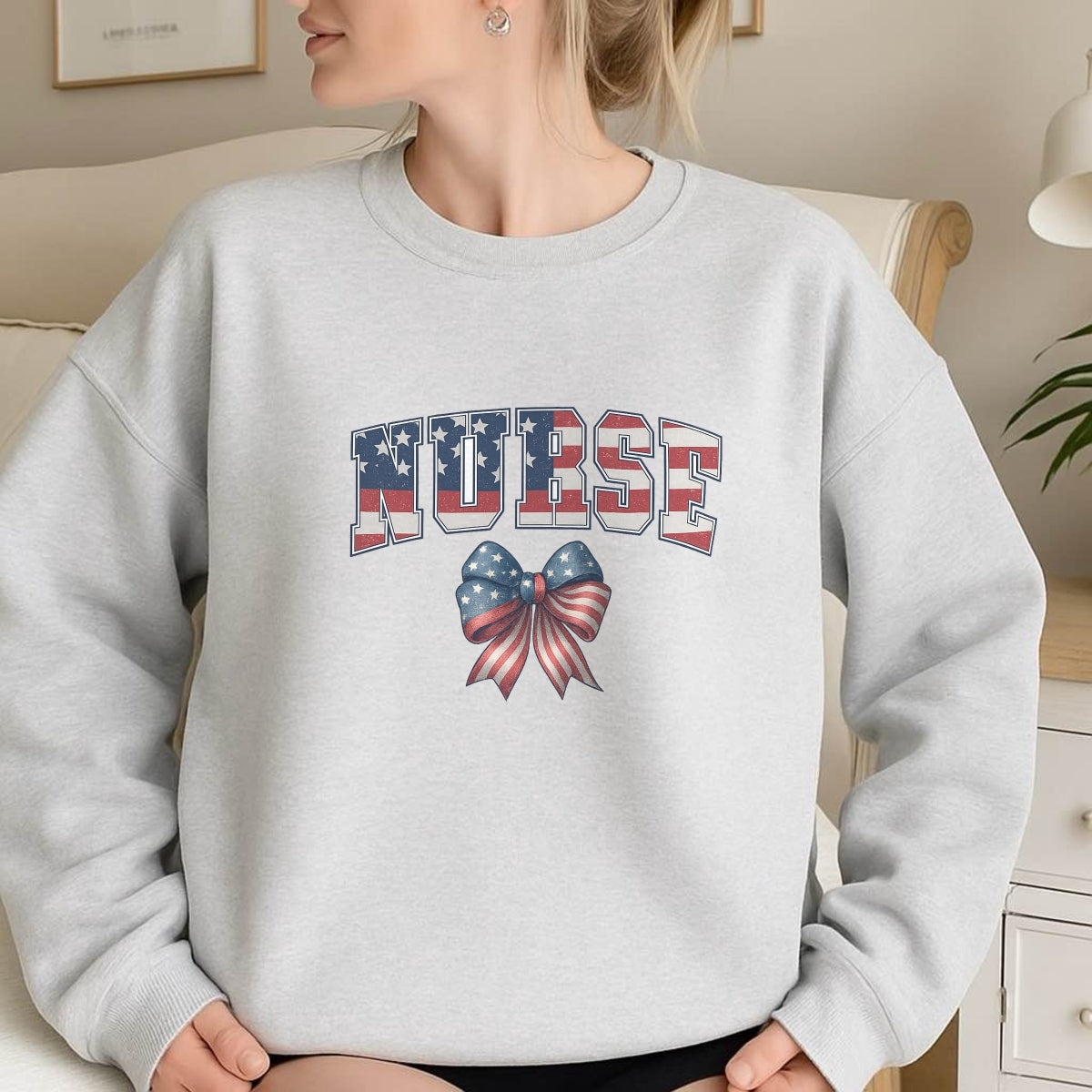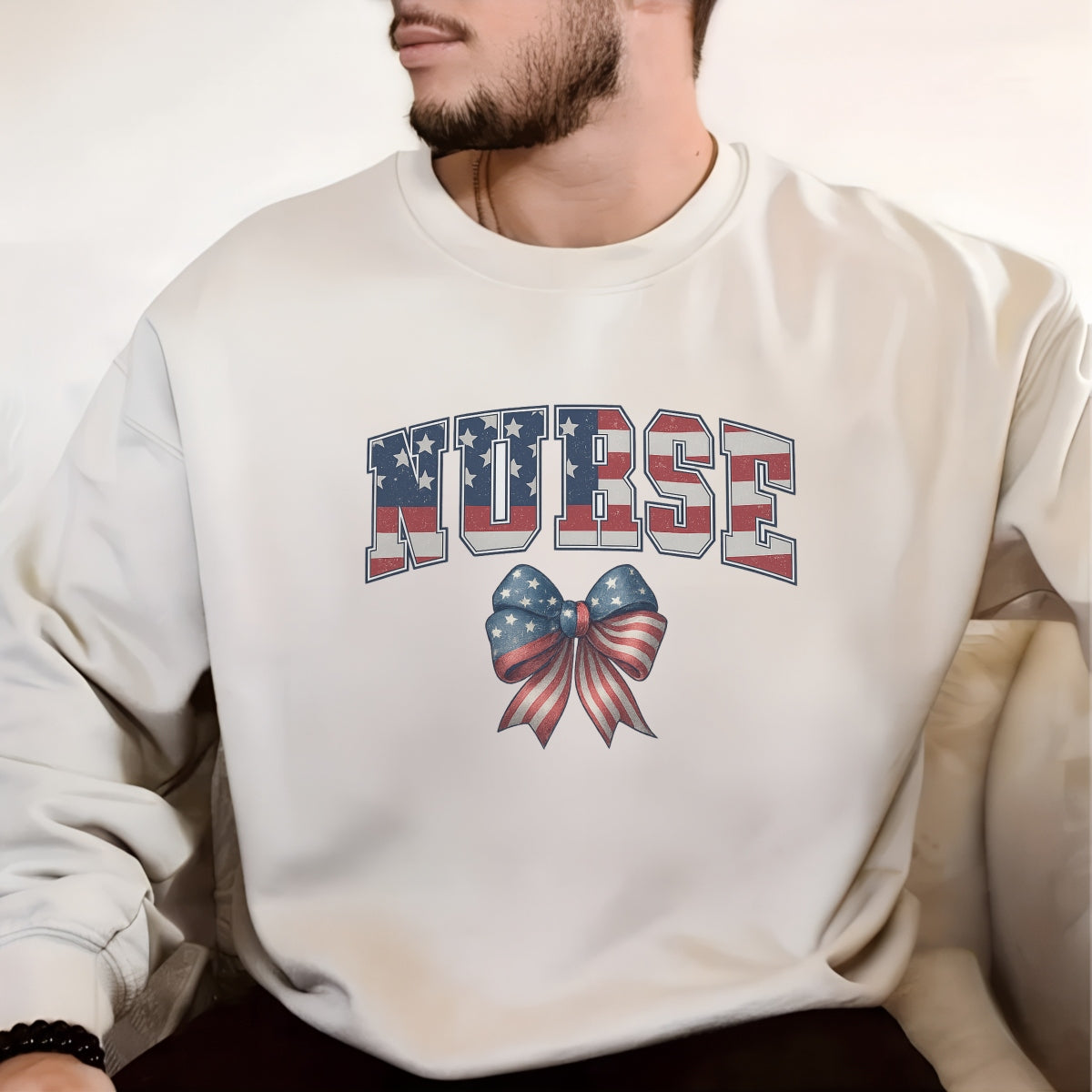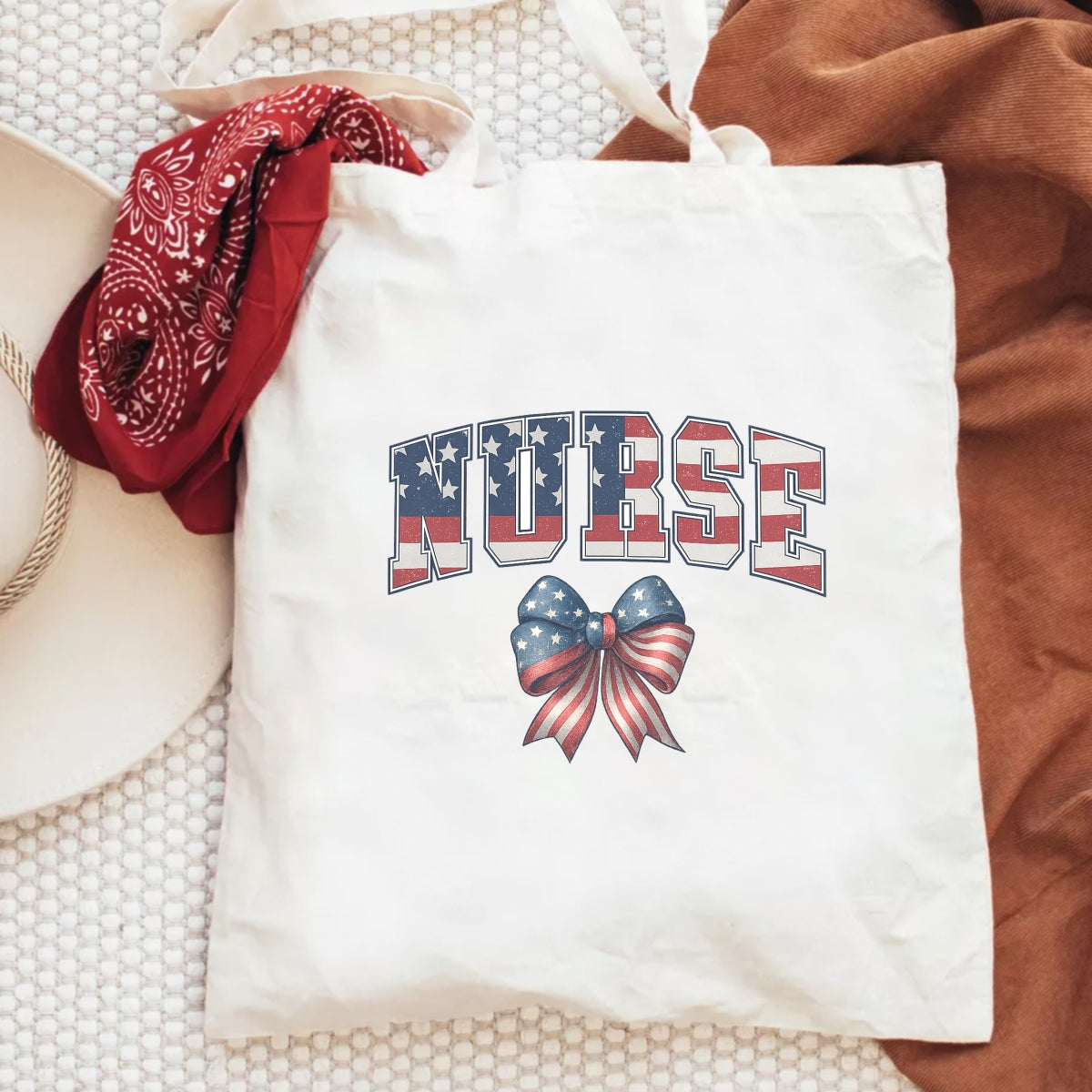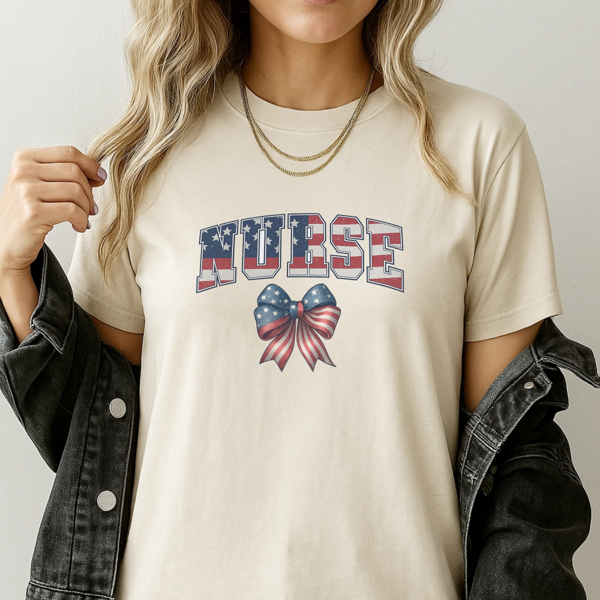 DTF Heat Transfer Iron On Sticker, Patriotic Nurse American Flag Bow Design, for Nurse Apparel and Patriotic Medical Merch