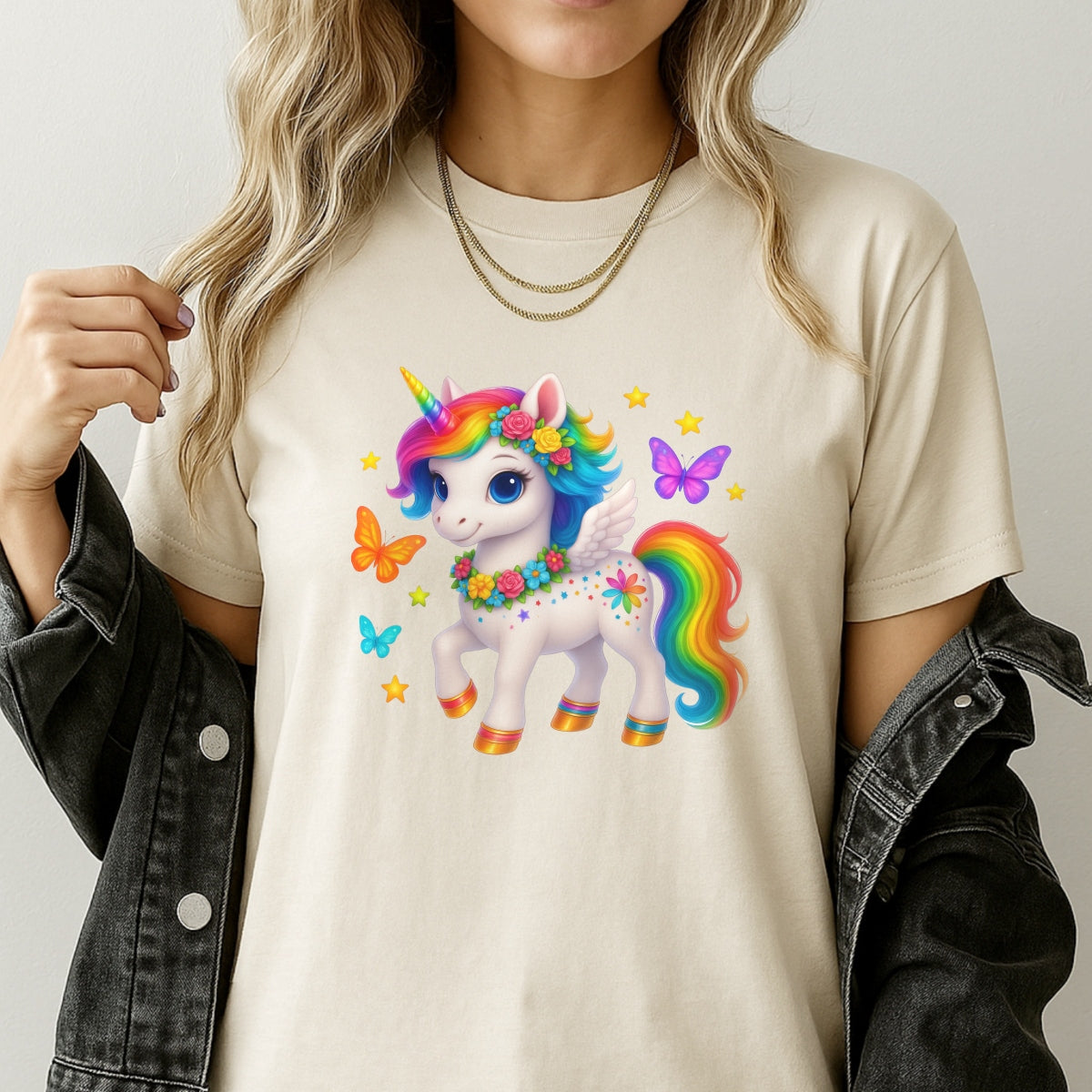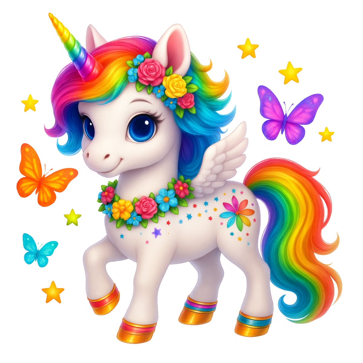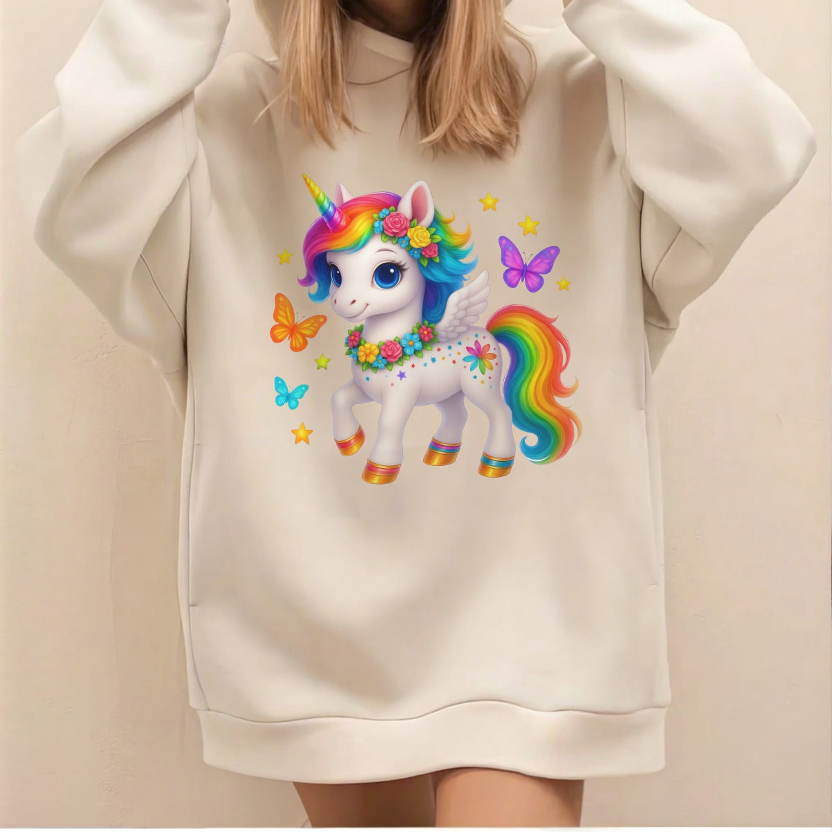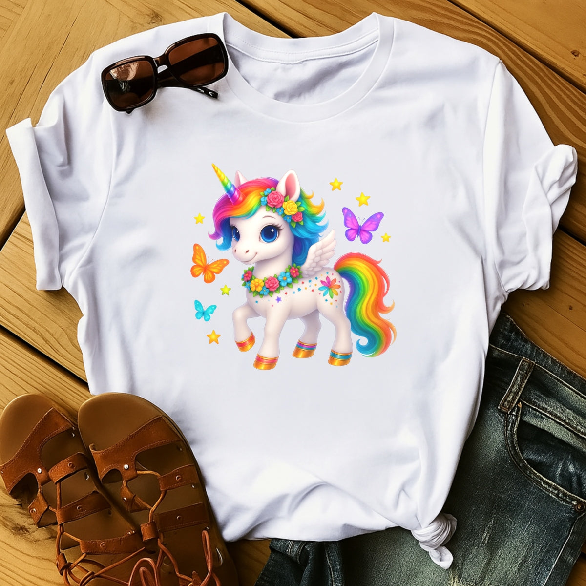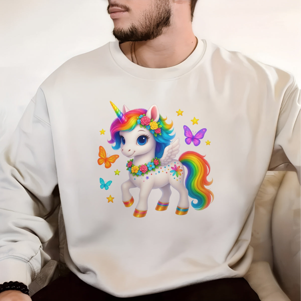 DTF Heat Transfer Iron On Sticker,Rainbow Unicorn with Wings, Flowers, and Stars Design for DIY Shirt, Fantasy Lover Gift, Magical Aesthetic Apparel Decoration
