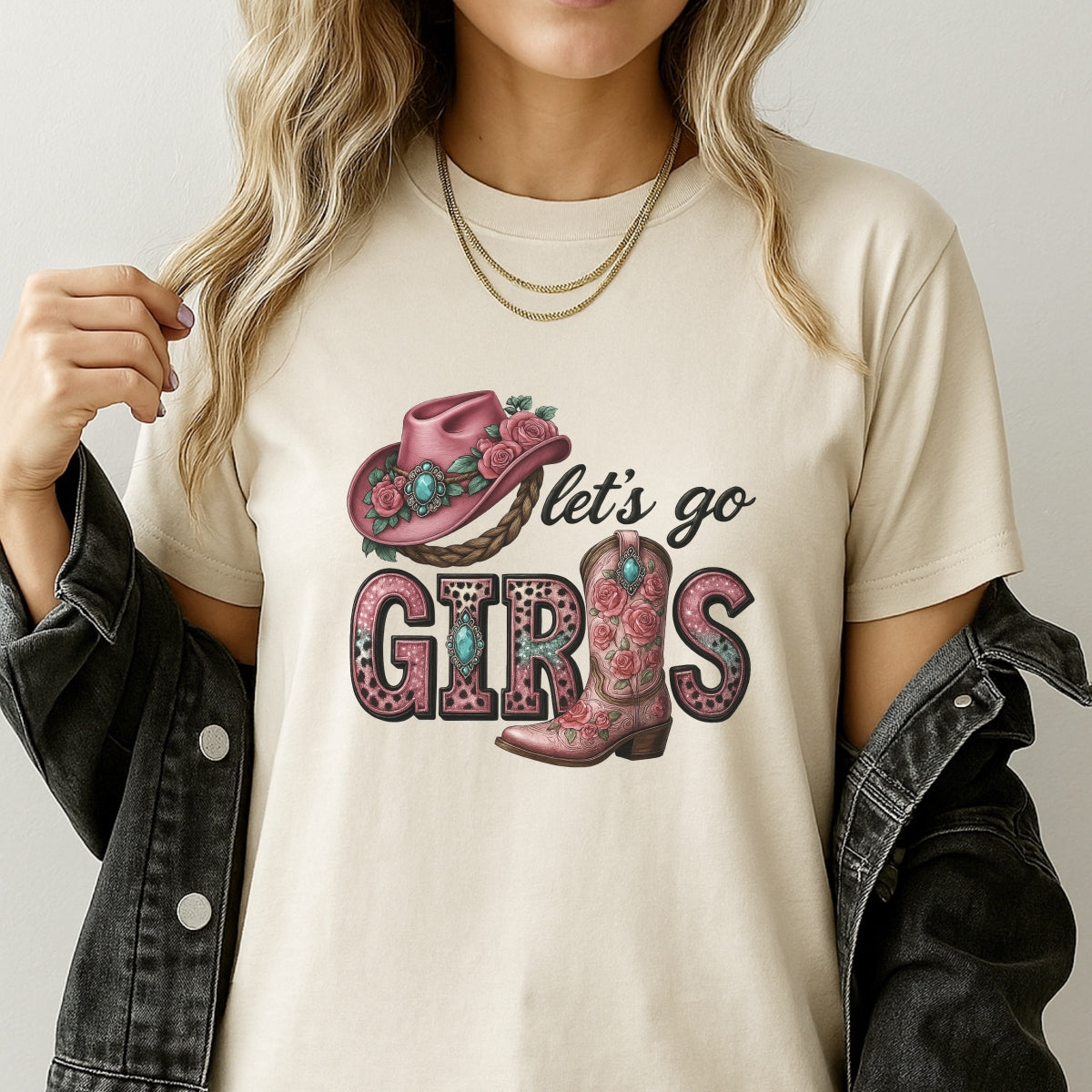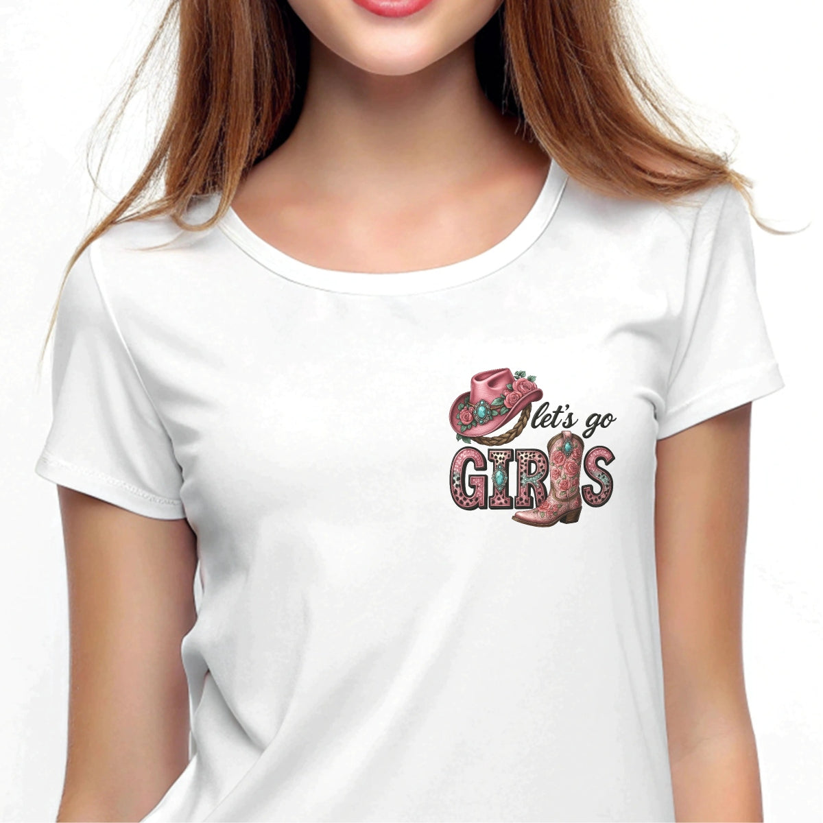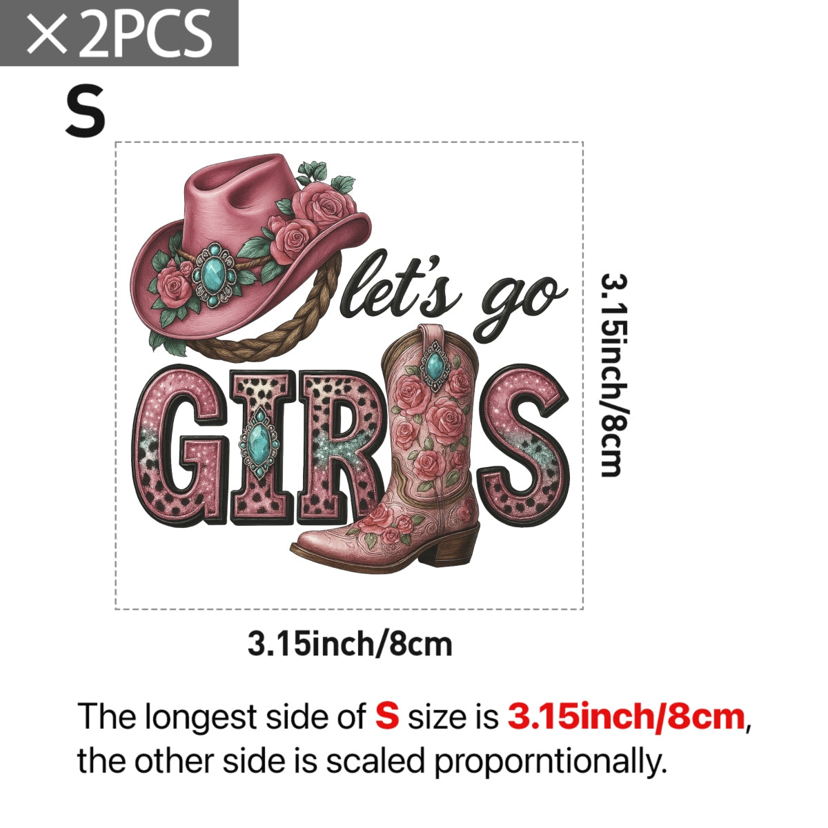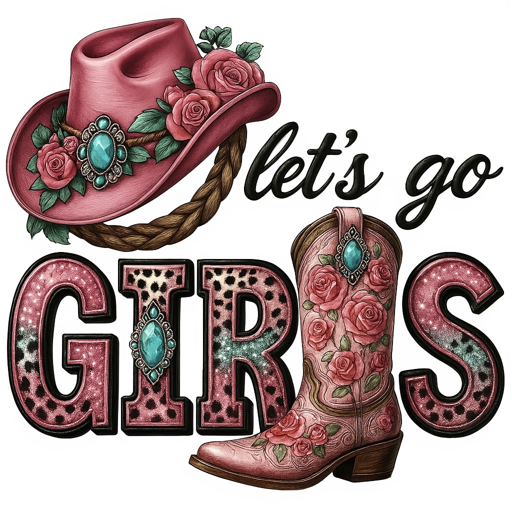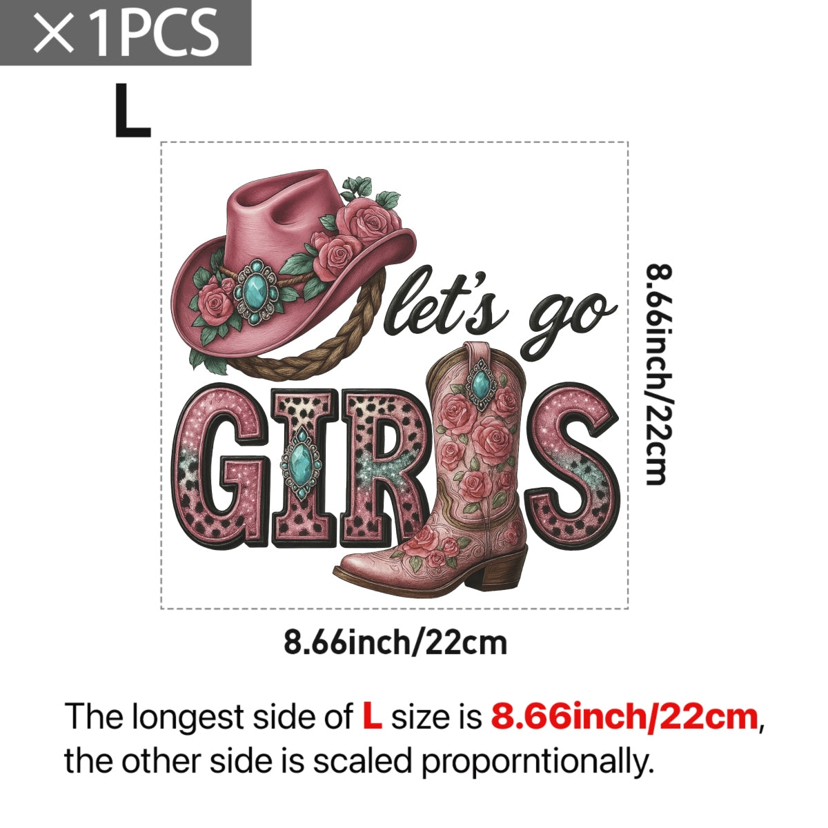 Let’s Go Girls Western DTF Transfer , Pink Cowgirl Hat and Boot Heat Press Iron-On for T-Shirts, Country Rodeo Style, Glitter Vinyl Look