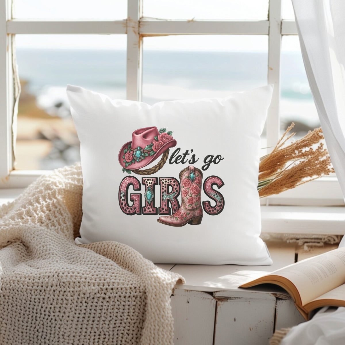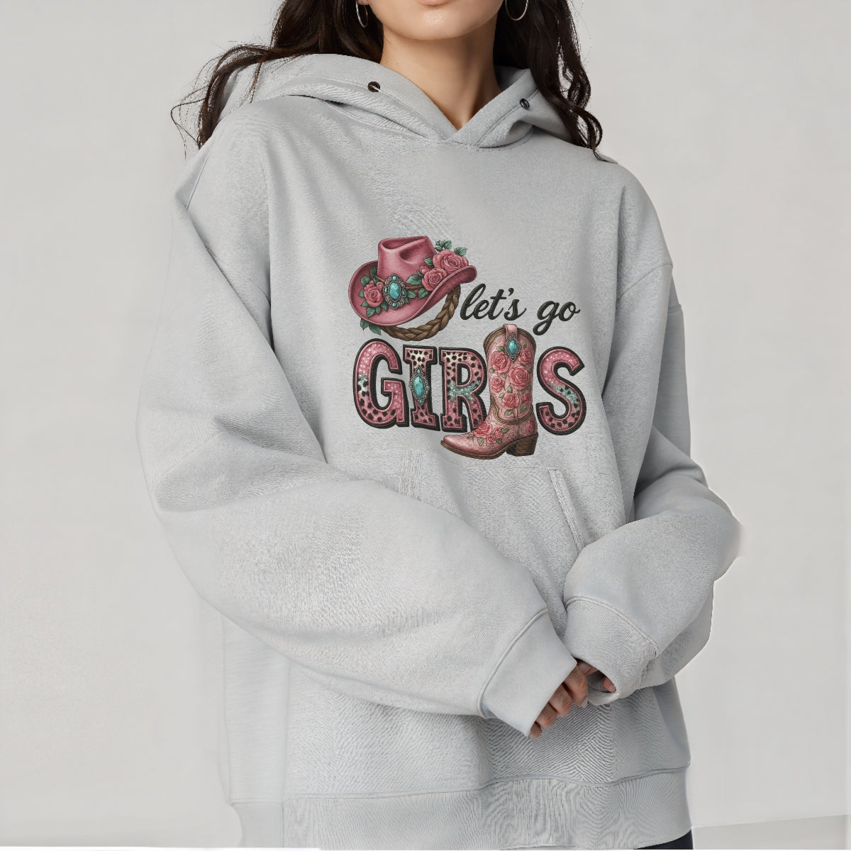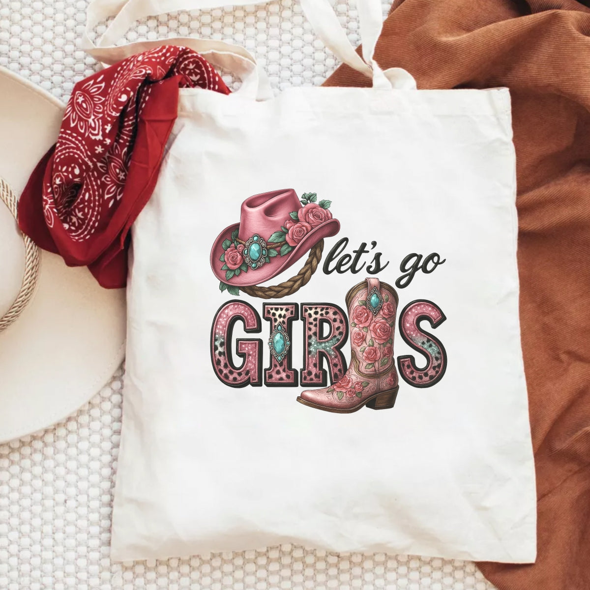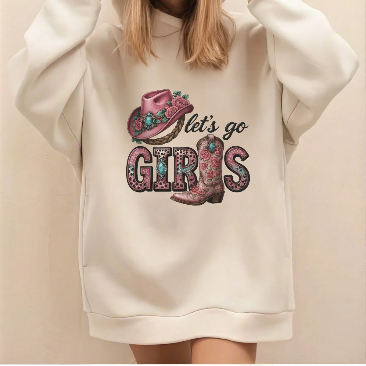 Let’s Go Girls Western DTF Transfer , Pink Cowgirl Hat and Boot Heat Press Iron-On for T-Shirts, Country Rodeo Style, Glitter Vinyl Look