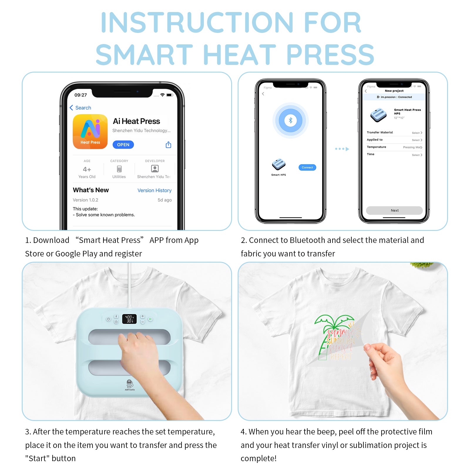 【SIMPLE TO OPERATE】— Big Heat Press Machine (12" x 10"=30.52cm x 25.4cm) for T-shirt ,Don't need to set the Temperature and Time of Hear press because of APP of heart press machine. Only need to set transfer material and which object you want to apply to by App of the mobile phone. Send precise settings via bluetooth as a helpful guide. Also work normally without using an app.
